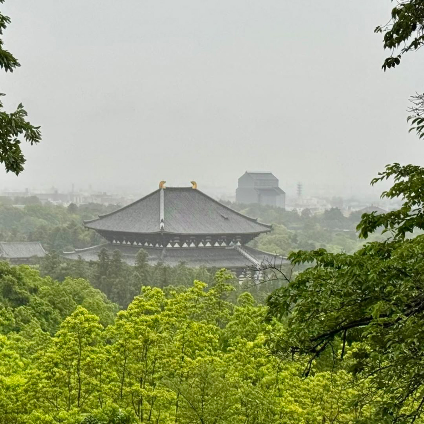 雨の東大寺大仏殿と奈良盆地です。